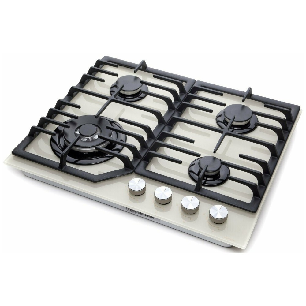 тип панели: газовая, количество конфорок: 4, материал панели: закаленное стекло, установка: независимая, переключатели: поворотные, ширина: 61 см, глубина: 51 см, газ-контроль конфорок, функции: Комплект для подключения газового баллона