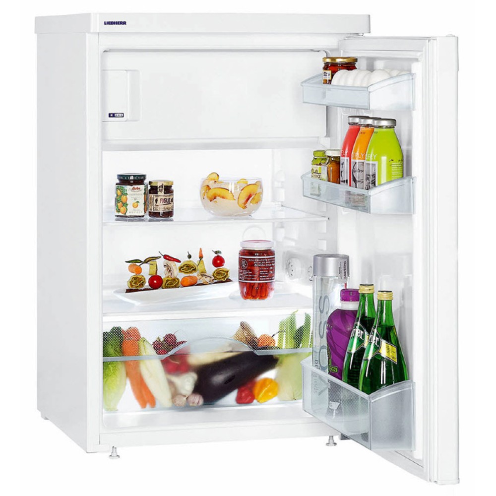 Холодильник Liebherr T 1504 — компактная отдельно стоящая модель высотой 85 см, которую можно устанавливать вплотную к стене. Устройство объемом 134 литра имеет одну дверцу и небольшую верхнюю морозильную камеру объемом 17 литров. Дверца при необходимости может быть перенавешена справа налево. Модель из серии SwingDesign выполнена в классическом белом цвете и привлекает внимание стильным глянцевым фасадом. В холодильной камере продукты размещаются на двух полках, изготовленных из ударопрочного стекла, одна из полок может регулироваться по высоте. Для хранения овощей и фруктов предусмотрен большой прозрачный пластиковый контейнер. На дверце расположены три полочки: с металлическим ограничителем для хранения бутылок, для консервов и мелких продуктов. Предусмотрена также подставка для яиц. Устройство оснащено системой Cool Plus, которая защищает морозильную камеру от размораживания при низких температурах окружающей среды. Морозильная камера поддерживает автономное сохранение холода в течение 10 часов. Регулировка температуры производится с помощью поворотного переключателя, расположенного внутри камеры. Уровень шума составляет всего 41 дБ.
