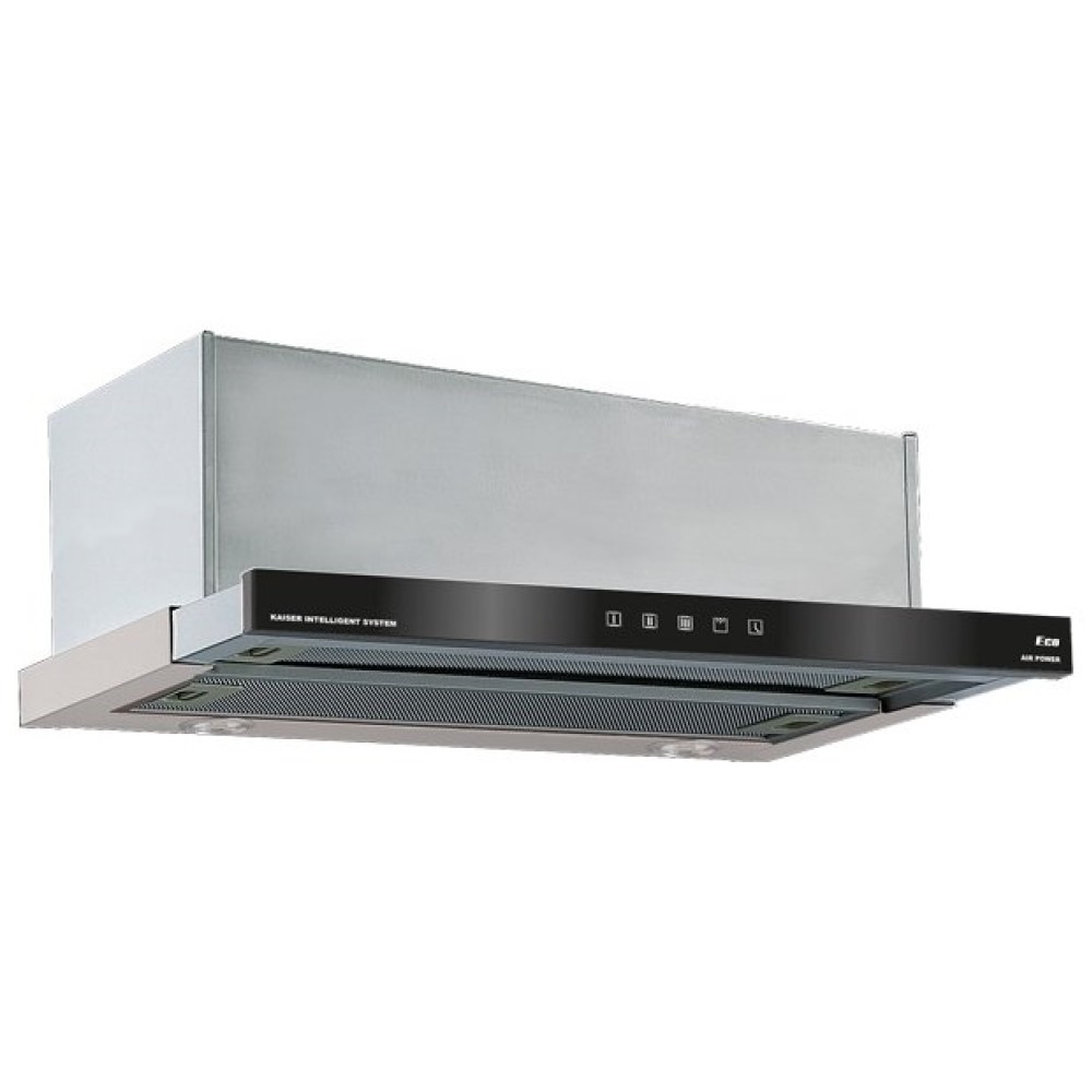 Вытяжка Kaiser EA644 Eco встраивается в шкаф, особенность модели - выдвижная панель c сенсорным управлением Full touch и LСD дисплеем. Прикосновением к сенсору включается одна из трех скоростей, зажигается светодиодное освещение, устанавливается таймер.