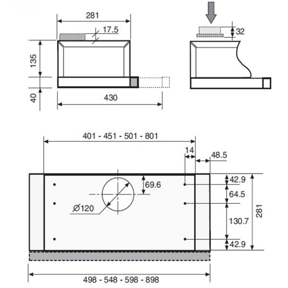| Габариты ниши для встраивания (ВхШхГ), см13.5 x 50.1 x 28.1 | Диаметр воздуховода (мм)120 | Размеры в режиме отвода воздуха (ВхШхГ)17.5 х 59.8 х 43 см |