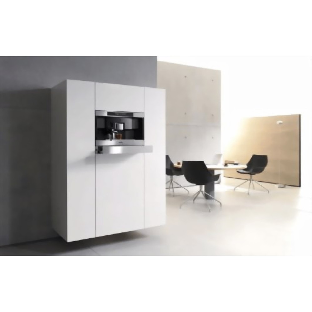 Ящик полностью выдвигается и фиксируется, что облегчает загрузку и извлечение посуды. Фронтальная часть изготовлена из нержавеющей стали с покрытием CleanSteel от отпечатков пальцев. Холодный фронт не позволит обжечься при выгрузке чашек из ящика. Максимальный вес загрузки составляет 15 кг.