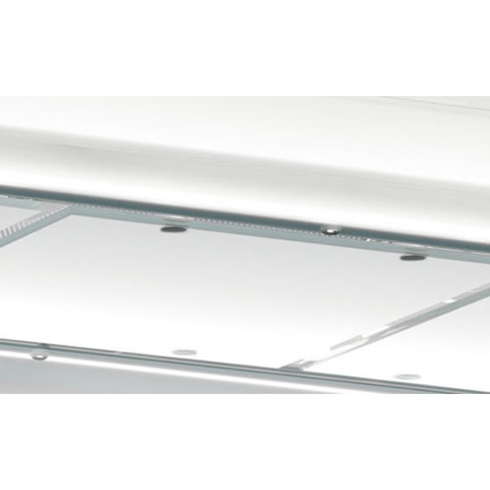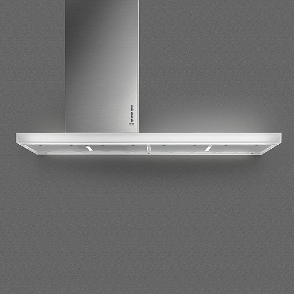 Вытяжка Falmec Lux 120 ix (800) ECP из нержавеющей стали и матового стекла представлена в корпусе Т-образной формы.