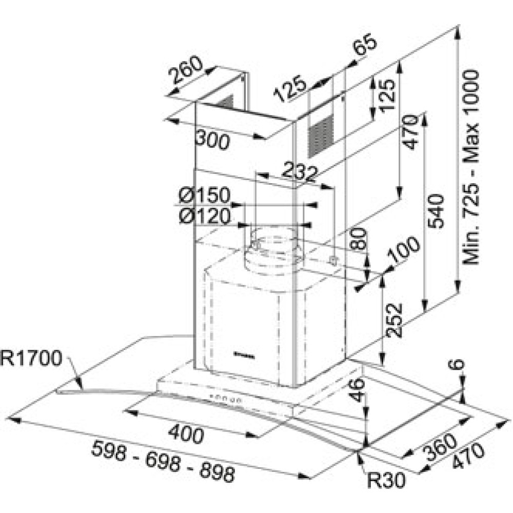 | Глубина (см)47 | Диаметр воздуховода (мм)120 / 150 | Максимальная высота (см)104.6 |